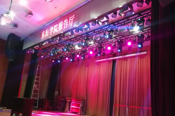 此次报告厅灯光音响改造的最大亮点,就是用吊挂式线阵音箱取代了传统的落地音箱。据施工技术人员介绍,通过布置在主席台两侧上方的2组线阵音箱,和环绕报告厅后方和左右的挂壁辅助音箱,为整个报告厅营造了影院级的优良声场效果。坐在观众席的任何一个位置都能感受到声源的真实存在,达到高保真重放的要求。