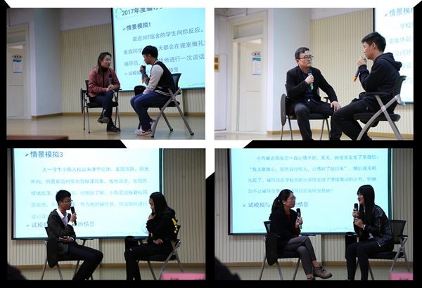 本次决赛全真模拟上海市辅导员职业技能大赛进行,分为即兴演讲和谈心谈话两部分。即兴演讲环节让参赛辅导员赛前15分钟现场抽题,进行限时5分钟即兴演讲。主要考察辅导员的逻辑思维及讲授能力;谈心谈话环节选手根据现场抽到的案例要求,以情景再现的方式开展谈心活动。该环节主要考察辅导员对相关政策的运用、对学生特点以及成长成才规律的掌握,以及运用思想政治教育观点对学生进行教育引导的能力。决赛试题内容涉及学风建设、心理健康教育、少数民族学生管理、校园贷等问题,均为日常工作中的典型事件,贴近工作实际,富有针对性和挑战性。