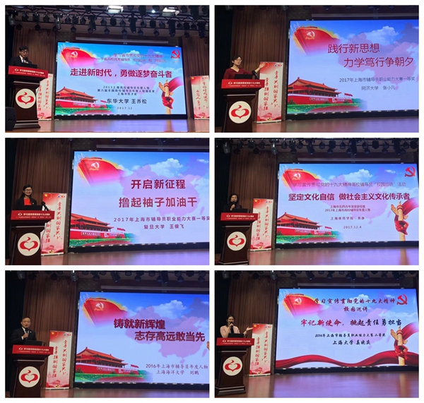 本次巡讲活动以“牢记时代使命,书写人生华章”为主题。2013年上海高校辅导员年度人物、上海市育才奖获得者,东华大学信息科学与技术学院党委专职党务干部王乔松,2017年上海高校辅导员职业能力大赛一等奖获得者、同济大学人文学院分团委书记、辅导员张小凡,2017年上海高校辅导员职业能力大赛一等奖获得者、复旦大学哲学学院学工组长王银飞,2013年上海高校辅导员年度人物、上海市五四青年奖章获得者、上海体育学院经济管理学院党总支副书记、副院长熊静,2016年上海高校辅导员年度人物、上海海洋大学食品学院辅导员刘鹏,2014年上海高校辅导员职业能力大赛二等奖获得者、上海大学党委研究生工作部研究生团工委书记姜晓庆等6位辅导员分别以《走进新时代,勇做逐梦奋斗者》、《践行新思想,力学笃行争朝夕》、《开启新征程,撸起袖子加油干》、《坚定文化自信,做社会主义文化传承者》、《铸就新辉煌,志存高远敢当先》、《牢记新使命,挑起责任勇担当》为题,结合辅导员的工作实际,着眼学生的时代视野,立足思政育人的使命担当,深入浅出地将十九大报告精神娓娓道来,用充分的数据和图片,声情并茂的全方位解读了祖国创新发展的能力和底气,阐释了五年来中国的魅力巨变,坚定了莘莘学子的中国梦想。宣讲内容深入浅出、贴近实际,让在场师生热血沸腾、受益匪浅,为我校师生进一步深入理解党的十九大精神,坚定政治信念,领会思想精髓;牢记时代使命,树立远大理想;不忘教育初心,引领青年成长,开拓了新的方向和思路。