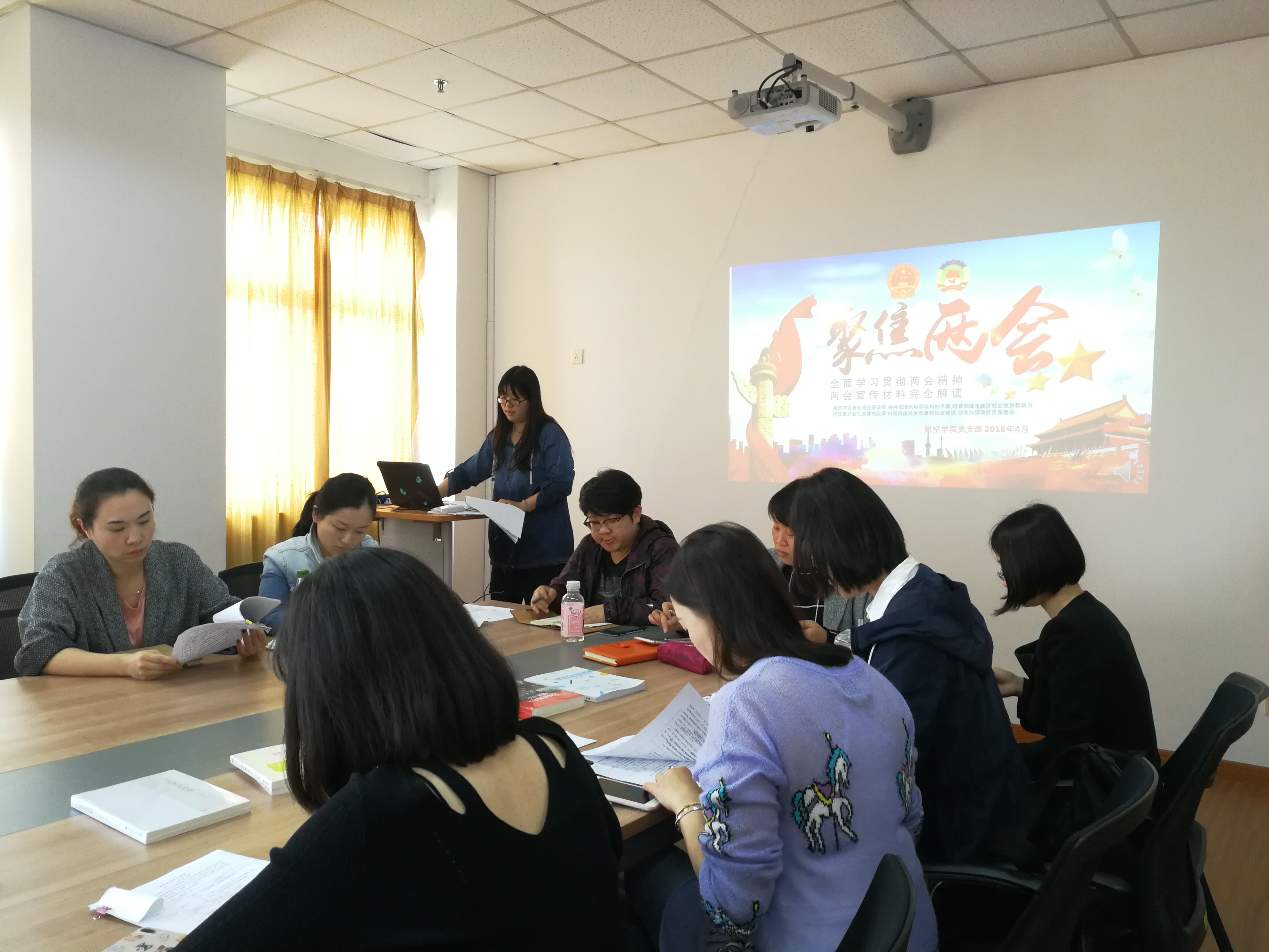 本次会议内容包括“两会”及“十九大”精神解读 、德育微课堂工作开展情况交流总结这两个部分。会上,第一部分由葛徐艳老师通过PPT展示2018年“两会”的主要内容及“两会”后的人民生活变化,并以10个数字盘点“两会”的重要精神,“两会”的报告中也指出当前我国社会主要矛盾发生了历史性转变,中国共产党提出的“全面小康”不仅仅是解决温饱、摆脱贫困,而是新发展理念在治国理政实践中的全方位渗入。第二部分,德育微课堂工作开展情况交流总结,会上四位老师代表结合自身实际开展德育工作的情况,分别发言:王舟老师的《东海文化之彬彬有礼在学院》 ;周菁老师的《美丽身影-在东海航空》;赵珊珊老师的《浅谈中国礼仪的起源及对现代礼仪的影响》;此外张敏老师就《民用航空法》课程思政改革与参会教师们进行研讨交流。
